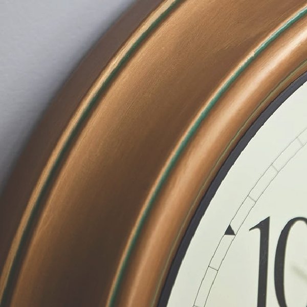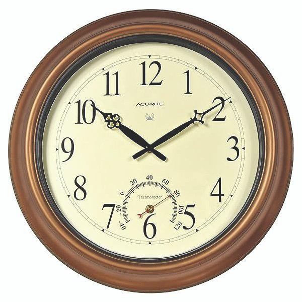 A stately wall clock for indoors and out, this 18-inch copper clock from Chaney Instruments dresses up any living room, patio or porch. A weather-resistant copper finish and solid metal construction ensure years of outdoor use. The Atomic Clock sets itself automatically for perfect time-even for Daylight Savings Time switches.