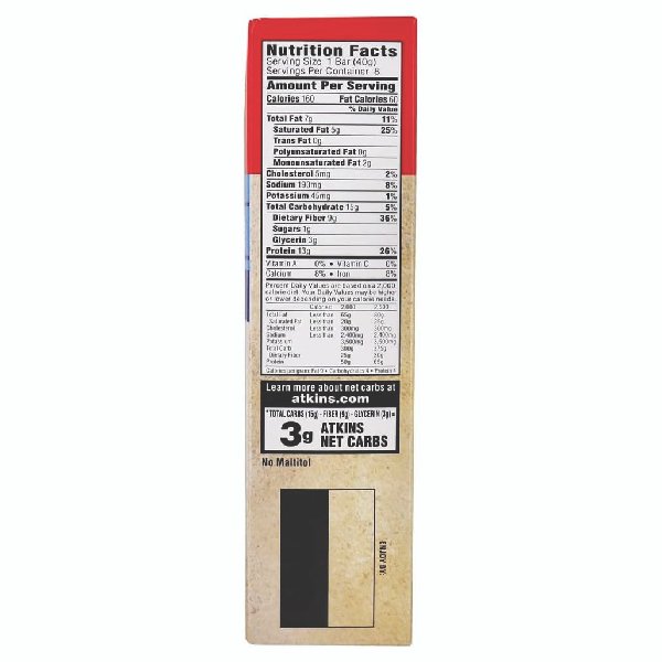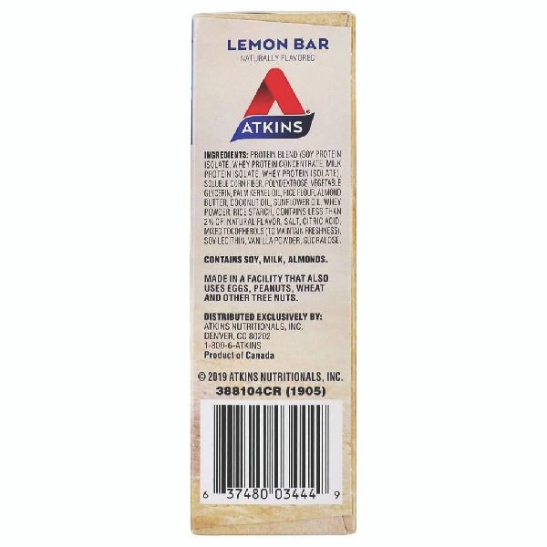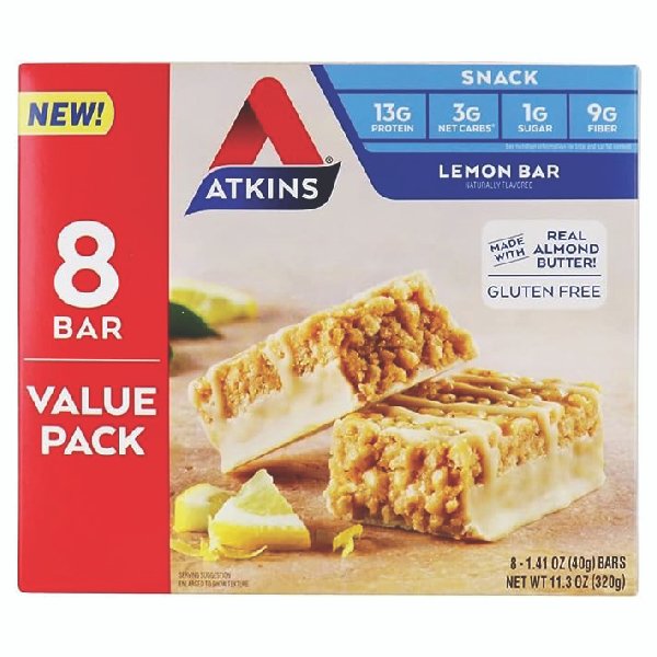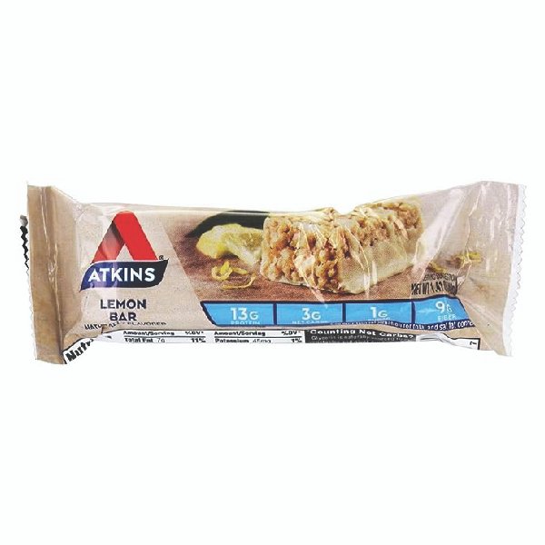 Atkins Lemon bar snack bars are a sweet combination of tangy lemon flavor and real almond butter. This snack bar packs all the nutrition your afternoon needs with 13 grams of protein, 1 gram of sugar and 9 grams of fiber per serving.