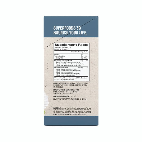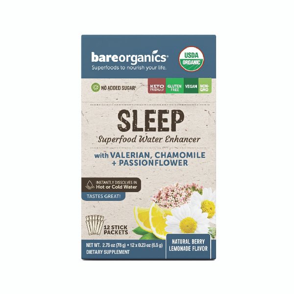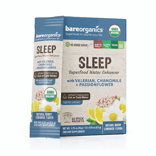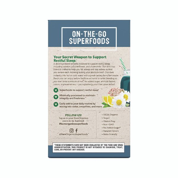 A delicious blend of herbs believed to support restful sleep, including Valerian, passionflower, and Chamomile. BareOrganics’ Delicious blend is crafted to help you fall asleep and stay asleep so that you awake each morning feeling your absolute best. It dissolves instantly into hot or cold water with a great-tasting berry Lemonade flavor you can enjoy at home or on-the-go. These statements have not been evaluated by the Food and Drug Administration. This product is not intended to diagnose, treat, cure, or prevent any disease.