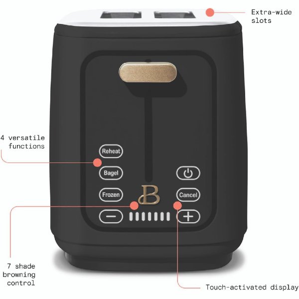 Our signature touch-activated display illuminates only when you need it. No dials, buttons or knobs. Made with long-lasting steel accents with a Soft Matte Premium finish. Powerful 900-watt toasting system. Extra wide, self-adjusting toast slots adapt for a variety of breads and bagels. Durable high-lift, die-cast lever provides access to smaller slices. Removable, slide-out crumb tray enables easy cleaning. Includes base cord wrap for a clutter-free countertop.