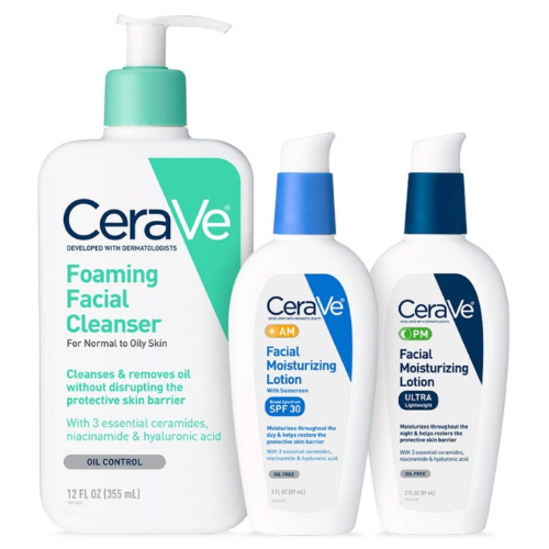 Includes CeraVe Foaming Facial Cleanser, AM Facial Moisturizing Lotion with Broad Spectrum SPF 30, and CeraVe PM Facial Moisturizing Lotion