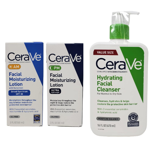 In this daily cleansing facial bundle, you will get Hydrating Facial Cleanser (16 oz), AM Facial Moisturizing Lotion (2 oz), and PM Facial Moisturizing Lotion (2 oz).