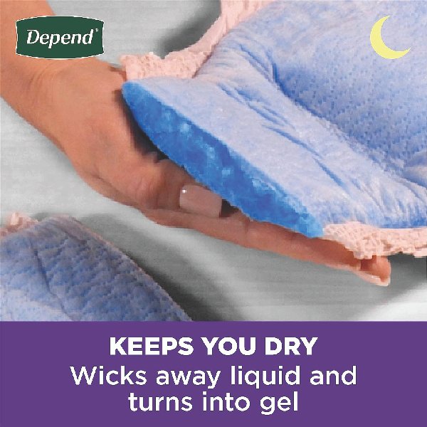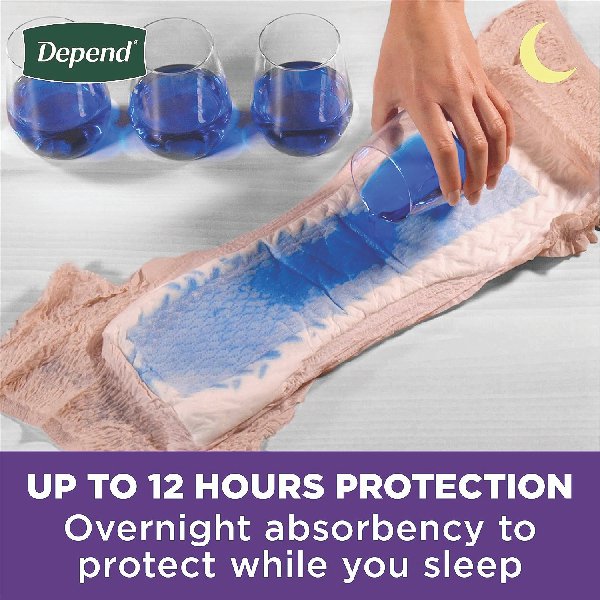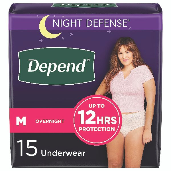 NEW LOOK: Depend Night Defense Adult Incontinence Underwear for Women, medium (31–37″ waist), 15 count; same trusted protection, improved; HSA/FSA-eligible in the U.S.—packaging may vary. Overnight Protection: Up to 12 hours Overnight Protection. Overnight Absorbency: Core absorbs 25x its weight and turns liquid to gel neutralizing odors and locking wetness in place. 2x Drier Than Before: Depend’s improved liner wicks wetness away from your skin to keep you dry. Comfort All Night: Discreet fit featuring soft, smooth fabric and a high-performance waistband to keep your disposable underwear securely in place, unlike bulky adult diapers.