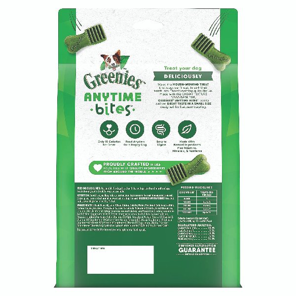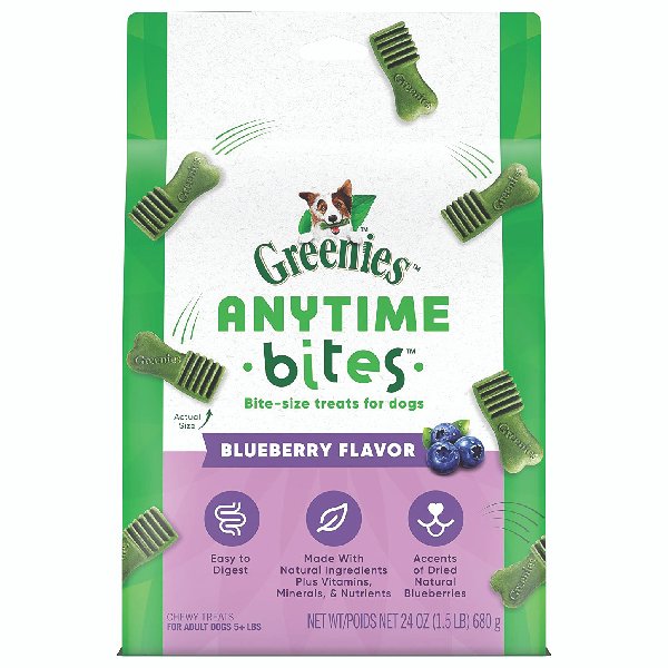 SMALL TREATS: Big flavor packed into small-sized dog treats specially designed for frequent treating. DELICIOUS BLUEBERRY FLAVOR: For an irresistible taste that will delight your dog. ONLY 15 CALORIES PER TREAT: This means you can feed these dog treats any time for a happy dog. CHEWY TREATS: Your dog will bark for these chewy treats that are easy to digest and made with natural ingredients plus vitamins, minerals and other nutrients. CONTAINS: One (1) 24 oz. bag of GREENIES Anytime Bites Blueberry Flavor dog treats