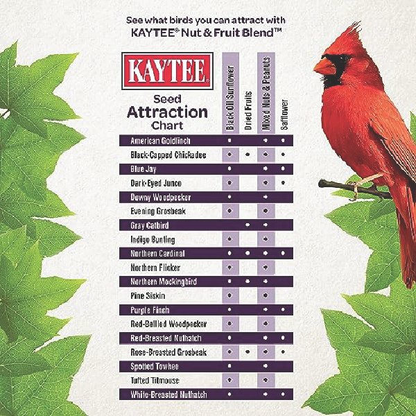 Kaytee Nut & Fruit Blend contains a rich mix of seeds and grains with added nut and fruit pieces. Pound for pound, nothing offers more energy than fruit & nuts to meet birds high-energy demands.