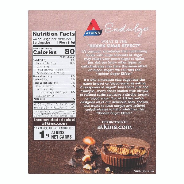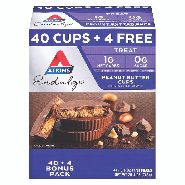Atkins Endulge Peanut Butter Cups Pack, Keto Friendly (44 ct.). 80 calories. 1 gram protein. 0 grams sugar. 1 gram of net carbs.