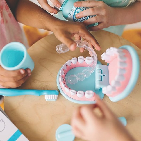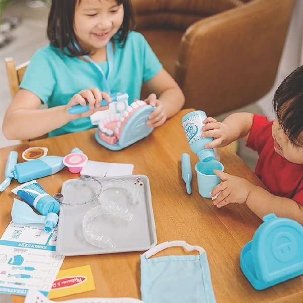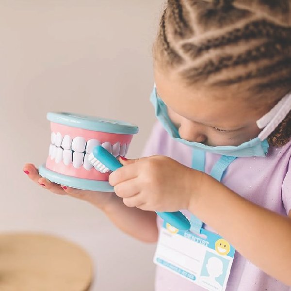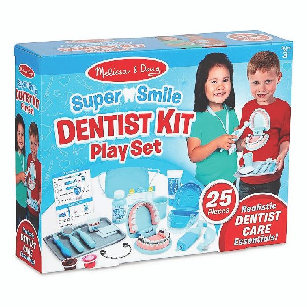 Smile, the dentist will see you now! This 25-piece dental care play set features an over-sized set of pretend teeth so young dentists-in-training can give cleanings, treat cavities, and even fit retainers and braces! Mark the pretend teeth with the dry-erase marker, then use the vibrating tool with interchangeable polishing and drill heads, and the toothbrush to clean.