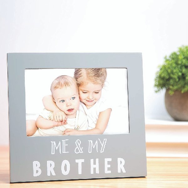 There’s no bond quite like the bond between a sibling and their brother. Celebrate that special bond with Pearhead’s “me and my brother” sentiment frame. This gray, wooden keepsake frame is the perfect decoration for baby’s nursery. The modern gray frame includes “me & my brother” printed in white on the front of the frame; making it the perfect decoration for a younger or older brother! Display this frame on any table or shelf with the included easel or hang around your home with the triangle hanger.