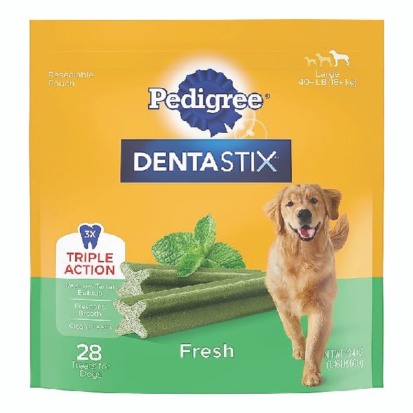 DENTASTIX Fresh Treats for Dogs are the minty fresh treat that make snack time even better for you and your large dog. Their chewy texture and unique X-shape design is clinically proven to reduce plaque and tartar buildup, so treat time promotes canine oral health and oral hygiene and better dental care too!