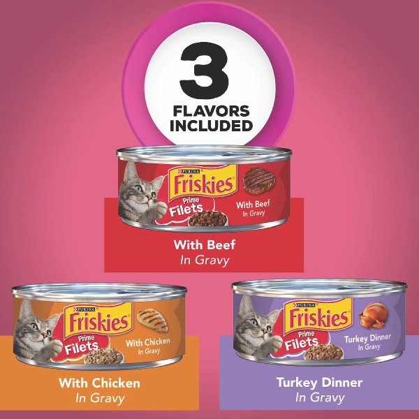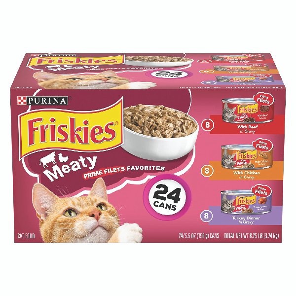 Twenty-Four (24) 5.5 oz. Cans – Purina Friskies Gravy Wet Cat Food Variety Pack, Prime Filets Meaty Favorites. Real beef. chicken or turkey for the tastes cats love. Savory gravy adds moisture and flavor. Tender chunks provide a tempting texture. Contains three different recipes for added variety in your cat’s diet. 100 percent complete and balanced nutrition for adult cats. Contains protein to help support lean, strong muscles. Contains taurine to help support healthy, clear vision. Packaged in recyclable cans