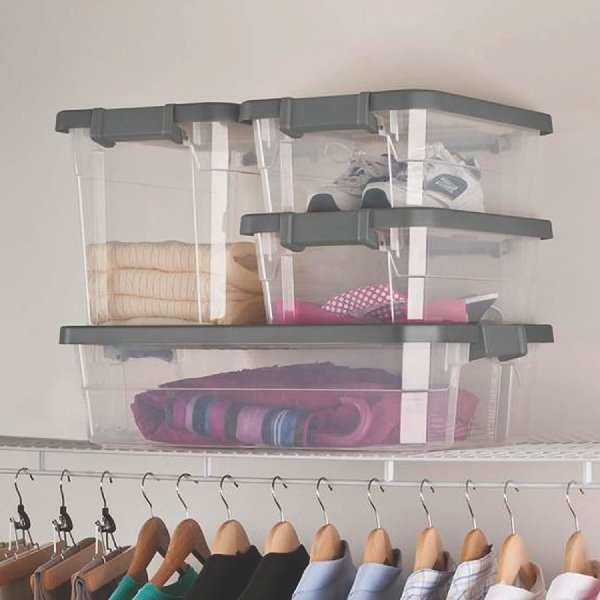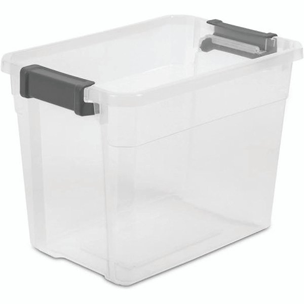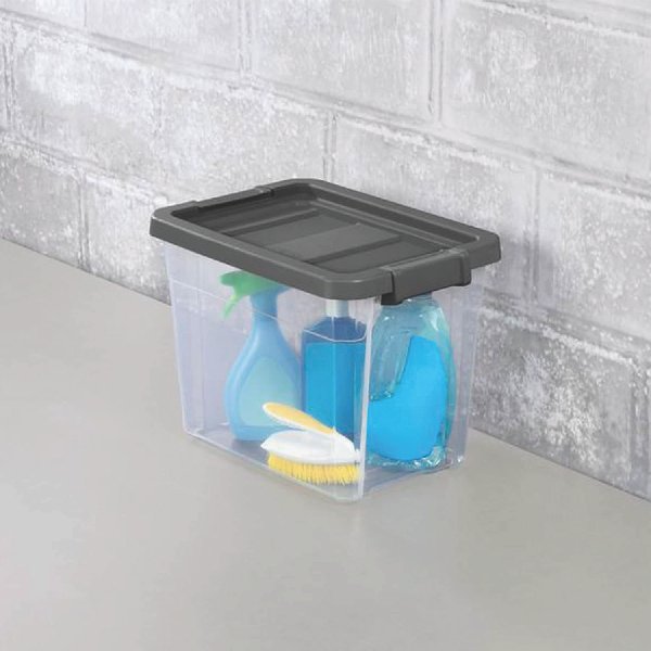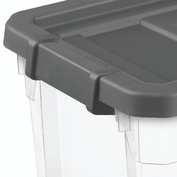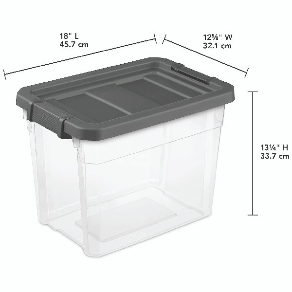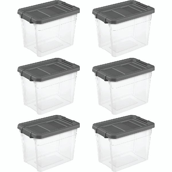 Pack of 6 Sterilite latch clip storage bins are the perfect size for boots, accessories, small household tools, and supplies. Durable and safe storage solution made of sturdy plastic materials that is ideal for garages, basements, attics, sheds, and more. Robust latches ensure the lid will stay attach to the base offering extra security, and the textured surface makes for a sure grip when carrying. Deep indexed lid surface allows multiple totes to stack securely. The clear bases make it easy to see what’s inside without having to open them up